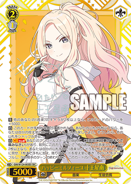 【自】【CXコンボ】 あなたのアンコールステップの始めに、CX置場に「仕事のつもりで臨みなさい」があり、前列にこのカードがいて、他のあなたの《音楽》のキャラが2枚以上なら、あなたは自分の山札を見て《音楽》のキャラを2枚まで選んで相手に見せ、1枚まで手札に加え、残りのカードを控え室に置き、その山札をシャッフルし、次の相手のターンの終わりまで、このカードのパワーを+1000。