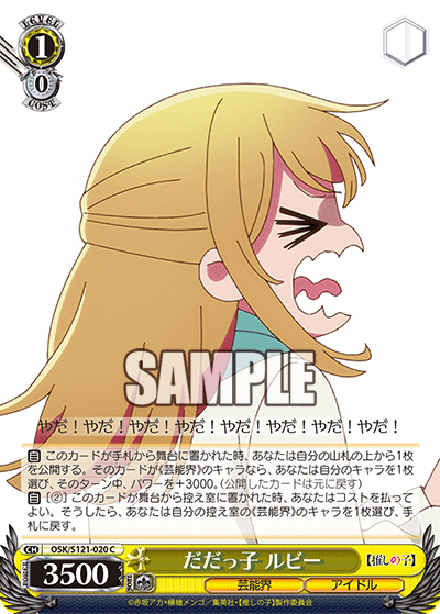 [A] – When this card is placed on Stage from Hand, reveal the top card of your Deck. If that card is a《Showbiz》Character, choose one of your《Showbiz》Characters, during this turn, it gains +3000 Power. (Return revealed card to its original position)
