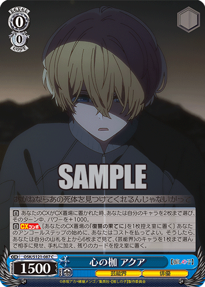 [A] – CX COMBO [Send one [服種の果てに] in your Climax Zone to Waiting Room] At the beginning of your Encore Step, you may pay the cost. If you did, look at up to six cards from the top of your Deck, choose up to one《Showbiz》Character among them, reveal it to your opponent, add it to Hand, send the remaining cards to Waiting Room.