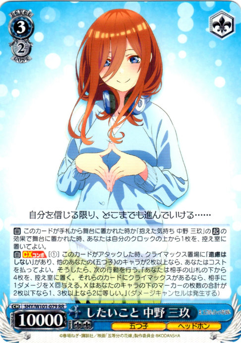 【自】 このカードが手札から舞台に置かれた時か「抱えた気持ち 中野 三玖」の【起】の効果で舞台に置かれた時、あなたは自分のクロックの上から1枚を、控え室に置いてよい。