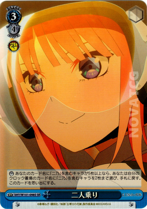 【カウンター】 あなたのカード名に「二乃」を含むキャラが5枚以上なら、あなたは自分のクロック置場のカード名に「二乃」を含むキャラを2枚まで選び、手札に戻す。このカードを思い出にする。