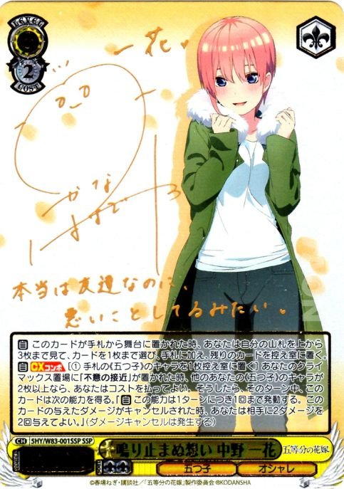 【自】【CXコンボ】[(1) 手札の《五つ子》のキャラを1枚控え室に置く] あなたのクライマックス置場に「不意の接近」が置かれた時、他のあなたの《五つ子》のキャラが2枚以上なら、あなたはコストを払ってよい。そうしたら、そのターン中、このカードは次の能力を得る。『【自】 この能力は1ターンにつき1回まで発動する。このカードの与えたダメージがキャンセルされた時、あなたは相手に2ダメージを2回与えてよい。』(ダメージキャンセルは発生する)