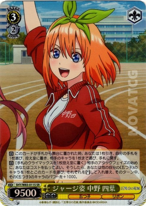 【自】[手札のクライマックスを1枚控え室に置く] 相手のアタックフェイズの始めに、あなたはコストを払ってよい。そうしたら、あなたは他の自分の《五つ子》のキャラを1枚とこのカードを選び、それぞれを【スタンド】して入れ替え、そのターン中、その《五つ子》のキャラのパワーを+1000。