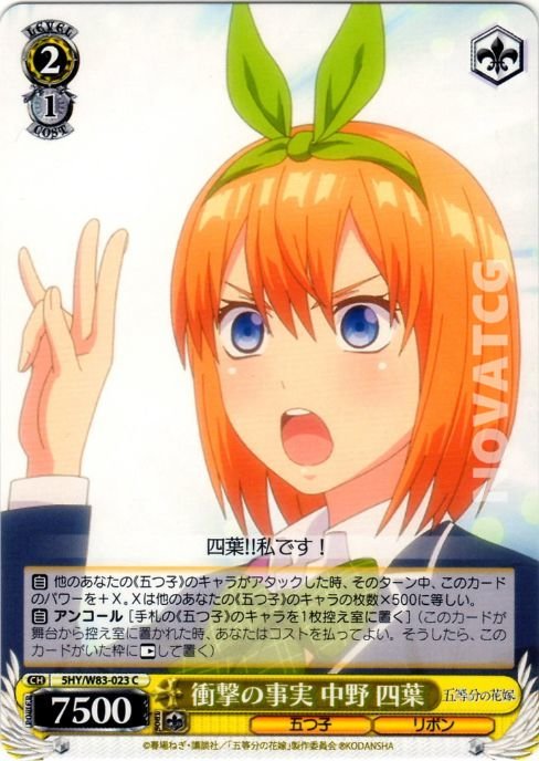 【自】 他のあなたの《五つ子》のキャラがアタックした時、そのターン中、このカードのパワーを+X。Xは他のあなたの《五つ子》のキャラの枚数×500に等しい。