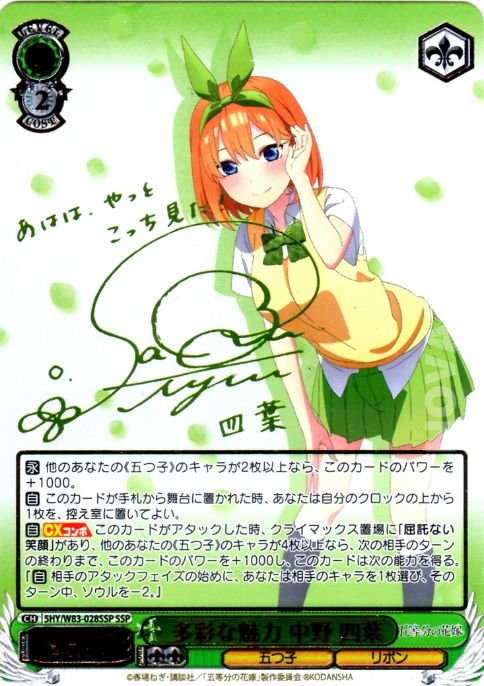 【自】【CXコンボ】 このカードがアタックした時、クライマックス置場に「屈託ない笑顔」があり、他のあなたの《五つ子》のキャラが4枚以上なら、次の相手のターンの終わりまで、このカードのパワーを+1000し、このカードは次の能力を得る。『【自】 相手のアタックフェイズの始めに、あなたは相手のキャラを1枚選び、そのターン中、ソウルを-2。』