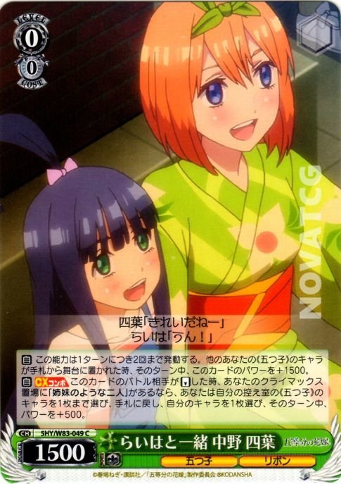 【自】 この能力は1ターンにつき2回まで発動する。他のあなたの《五つ子》のキャラが手札から舞台に置かれた時、そのターン中、このカードのパワーを+1500。