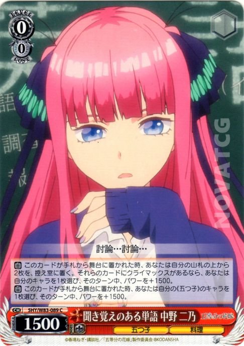 【自】 このカードが手札から舞台に置かれた時、あなたは自分の《五つ子》のキャラを1枚選び、そのターン中、パワーを+1500。