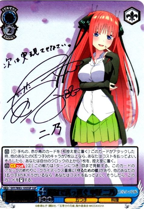 【自】【CXコンボ】[(2)] この能力は1ターンにつき1回まで発動する。このカードのアタックの終わりに、クライマックス置場に「守るための嘘」があり、他のあなたの《五つ子》のキャラがいるなら、あなたはコストを払ってよい。そうしたら、このカードを【スタンド】する。
