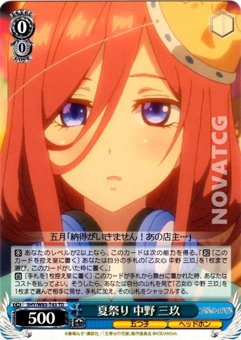 【永】 あなたのレベルが2以上なら、このカードは次の能力を得る。『【起】[このカードを控え室に置く] あなたは自分の手札の「乙女心 中野 三玖」を1枚まで選び、このカードがいた枠に置く。』
