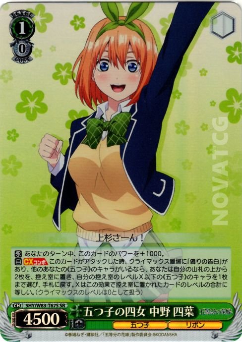 【自】【CXコンボ】 このカードがアタックした時、クライマックス置場に「偽りの告白」があり、他のあなたの《五つ子》のキャラがいるなら、あなたは自分の山札の上から2枚を、控え室に置き、自分の控え室のレベルX以下の《五つ子》のキャラを1枚まで選び、手札に戻す。Xはこの効果で控え室に置かれたカードのレベルの合計に等しい。(クライマックスのレベルは0として扱う)