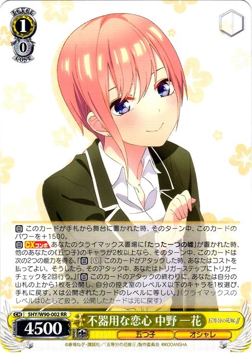 【自】【CXコンボ】 あなたのクライマックス置場に「たった一つの嘘」が置かれた時、他のあなたの《五つ子》のキャラが2枚以上なら、そのターン中、このカードは次の2つの能力を得る。『【自】[(1)] このカードがアタックした時、あなたはコストを払ってよい。そうしたら、そのアタック中、あなたはトリガーステップにトリガーチェックを2回行う。』『【自】 このカードのアタックの終わりに、あなたは自分の山札の上から1枚を公開し、自分の控え室のレベルX以下のキャラを1枚選び、手札に戻す。Xは公開されたカードのレベルに等しい。』(クライマックスのレベルは0として扱う。公開したカードは元に戻す)