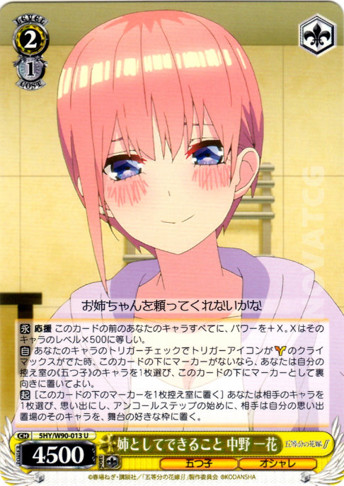 のクライマックスがでた時、このカードの下にマーカーがないなら、あなたは自分の控え室の《五つ子》のキャラを1枚選び、このカードの下にマーカーとして裏向きに置いてよい。