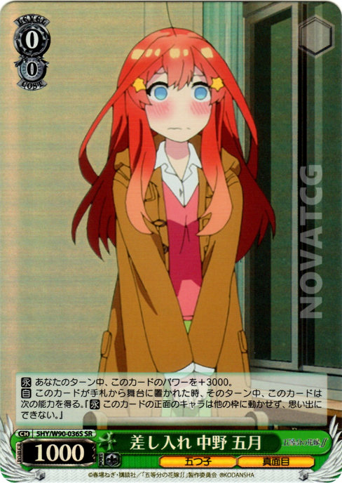 【自】 このカードが手札から舞台に置かれた時、そのターン中、このカードは次の能力を得る。『【永】 このカードの正面のキャラは他の枠に動かせず、思い出にできない。』