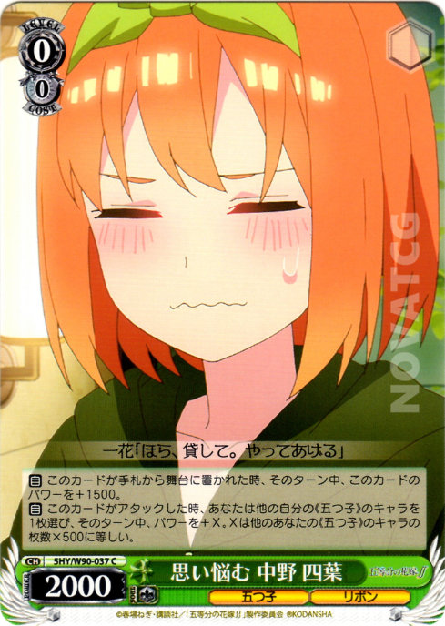 [A] – When this card attacks, choose one of your other《Quintuplets》Characters, during this turn, it gains +X Power. X is the number of your other《Quintuplets》Characters x500.