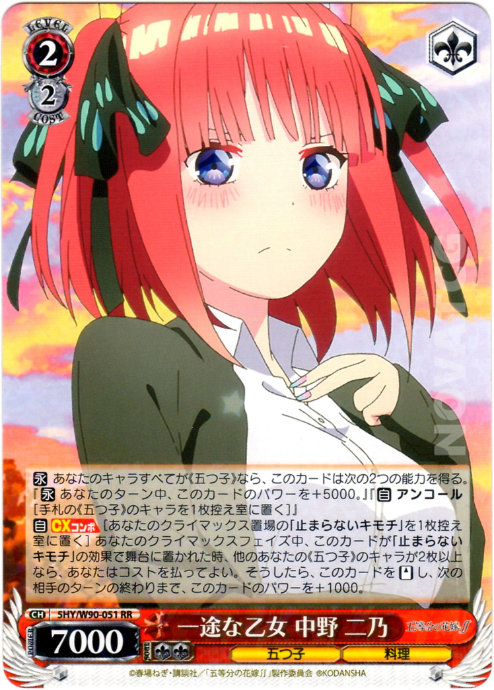 【自】【CXコンボ】[あなたのクライマックス置場の「止まらないキモチ」を1枚控え室に置く] あなたのクライマックスフェイズ中、このカードが「止まらないキモチ」の効果で舞台に置かれた時、他のあなたの《五つ子》のキャラが2枚以上なら、あなたはコストを払ってよい。そうしたら、このカードを【スタンド】し、次の相手のターンの終わりまで、このカードのパワーを+1000。