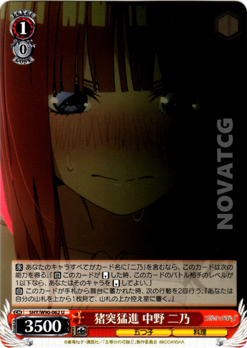 【永】 あなたのキャラすべてがカード名に「二乃」を含むなら、このカードは次の能力を得る。『【自】 このカードが【リバース】した時、このカードのバトル相手のレベルが1以下なら、あなたはそのキャラを【リバース】してよい。』
