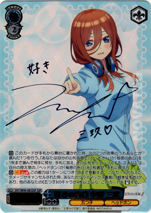 [A] – CX COMBO This effect activates up to once per turn, if this card’s dealt damage is cancelled, if you have [好きなもの] in your Climax Zone, if you have four or more other《Quintuplets》Characters, STAND this card.”