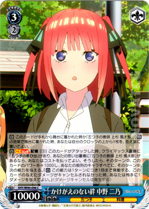 【自】【CXコンボ】 記憶 [(3)] このカードがアタックした時、クライマックス置場に「五つ子の思ひ出」があり、あなたの思い出置場に「五つ子の教師 上杉 風太郎」があるなら、あなたはコストを払ってよい。そうしたら、そのターン中、このカードのパワーを+1000し、あなたの前列のキャラすべてに、そのターン中、次の能力を与える。『【自】 この能力は1ターンにつき1回まで発動する。このカードの与えたダメージがキャンセルされなかった時、あなたは相手に1ダメージを与えてよい。』(ダメージキャンセルは発生する)