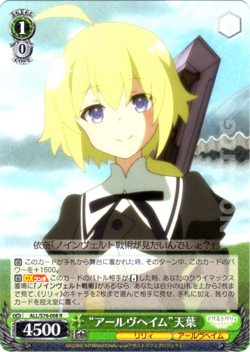 【自】【CXコンボ】 このカードのバトル相手が【リバース】した時、あなたのクライマックス置場に「ノインヴェルト戦術」があるなら、あなたは自分の山札を上から2枚まで見て、《リリィ》のキャラを2枚まで選んで相手に見せ、手札に加え、残りのカードを控え室に置く。