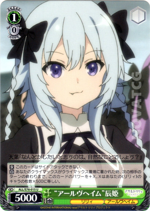 【自】 あなたのクライマックスがクライマックス置場に置かれた時、次の相手のターンの終わりまで、このカードのパワーを+X。Xはあなたの《リリィ》のキャラの枚数×500に等しい。