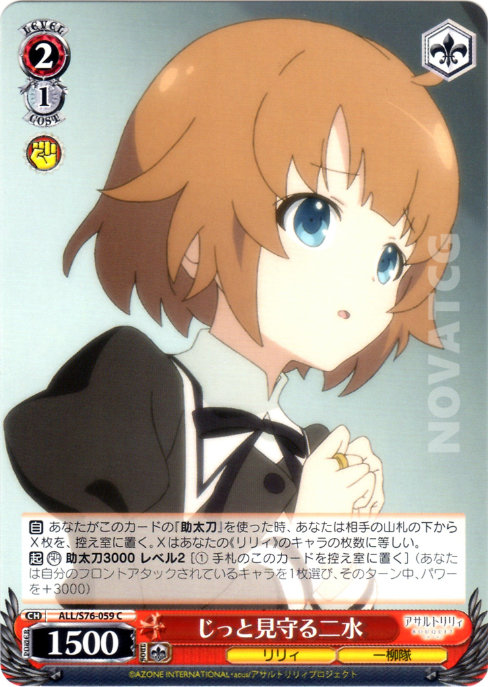 【自】 あなたがこのカードの『助太刀』を使った時、あなたは相手の山札の下からX枚を、控え室に置く。Xはあなたの《リリィ》のキャラの枚数に等しい。