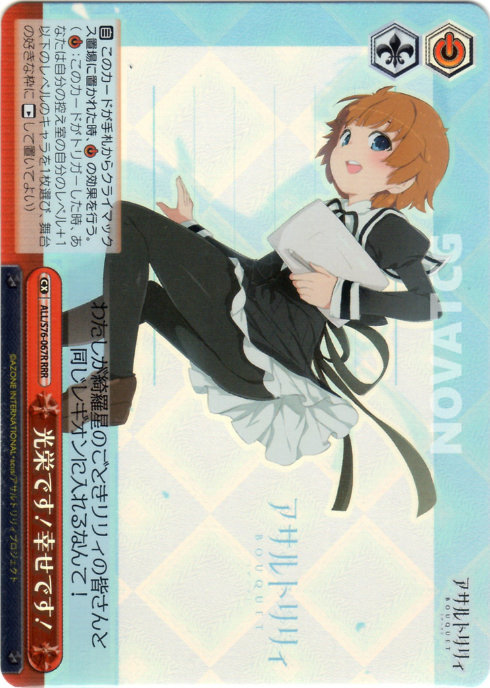 :このカードがトリガーした時、あなたは自分の控え室の自分のレベル+1以下のレベルのキャラを1枚選び、舞台の好きな枠に【レスト】して置いてよい)