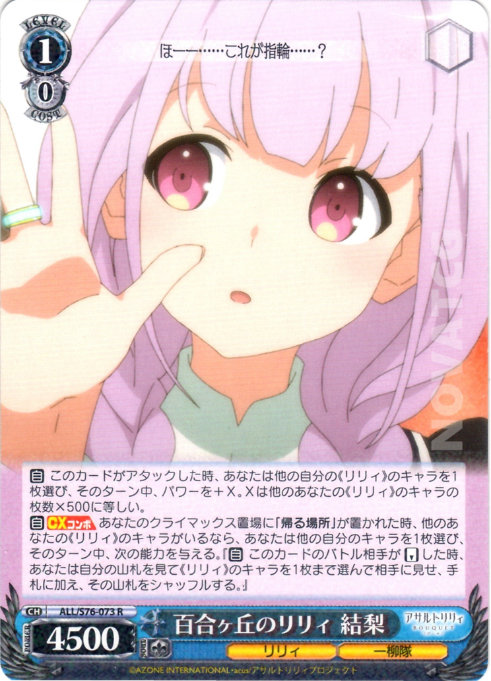【自】 このカードがアタックした時、あなたは他の自分の《リリィ》のキャラを1枚選び、そのターン中、パワーを+X。Xは他のあなたの《リリィ》のキャラの枚数×500に等しい。