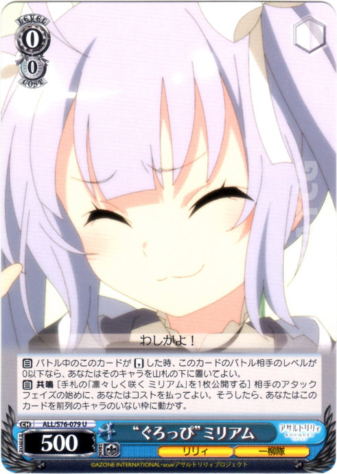 【自】 共鳴 [手札の「凛々しく咲く ミリアム」を1枚公開する] 相手のアタックフェイズの始めに、あなたはコストを払ってよい。そうしたら、あなたはこのカードを前列のキャラのいない枠に動かす。
