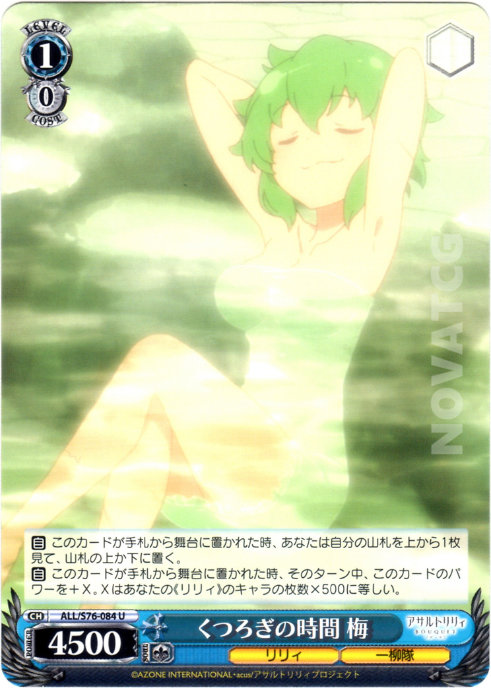 【自】 このカードが手札から舞台に置かれた時、そのターン中、このカードのパワーを+X。Xはあなたの《リリィ》のキャラの枚数×500に等しい。