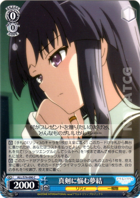 【自】[手札の《リリィ》のキャラを1枚控え室に置く] このカードが手札から舞台に置かれた時、あなたはコストを払ってよい。そうしたら、あなたは自分の山札を見て「シュッツエンゲルとしてシルトへ」を1枚まで選んで相手に見せ、手札に加え、その山札をシャッフルする。