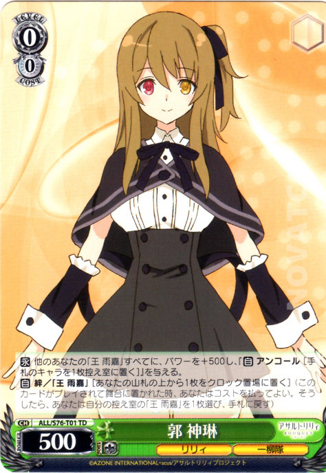【永】 他のあなたの「王 雨嘉」すべてに、パワーを+500し、『【自】 アンコール [手札のキャラを1枚控え室に置く]』を与える。