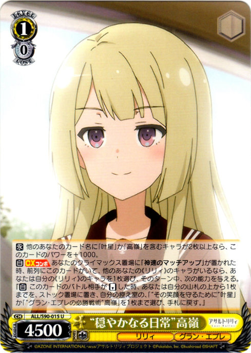 -[A] – When this card’s battle opponent is REVERSE, you may send the top card of your Deck to Stock, choose up to one [“その笑顔を守るために”叶星] or [”グラン•エプレの必勝戦術”高嶺] in your Waiting Room, add it to Hand.