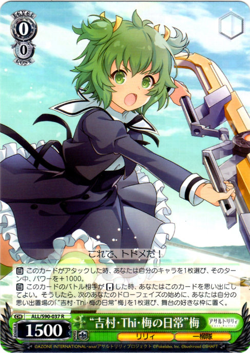 【自】 このカードのバトル相手が【リバース】した時、あなたはこのカードを思い出にしてよい。そうしたら、次のあなたのドローフェイズの始めに、あなたは自分の思い出置場の「“吉村・Thi・梅の日常”梅」を1枚選び、舞台の好きな枠に置く。