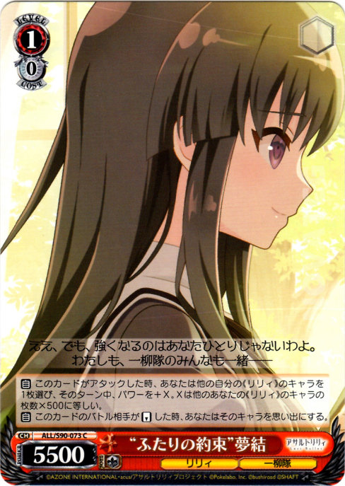 【自】 このカードがアタックした時、あなたは他の自分の《リリィ》のキャラを1枚選び、そのターン中、パワーを+X。Xは他のあなたの《リリィ》のキャラの枚数×500に等しい。