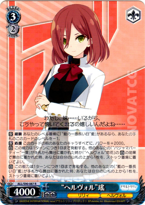 【永】 経験 あなたのレベル置場に「“藍の一番長い日”藍」があるなら、あなたの手札のこのカードのレベルを-1。