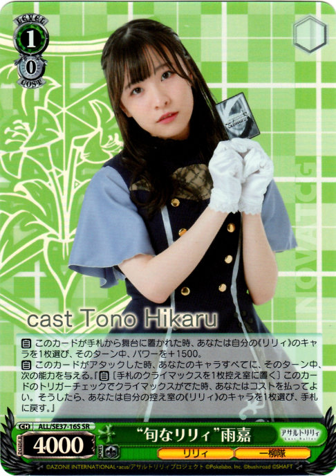 【自】 このカードが手札から舞台に置かれた時、あなたは自分の《リリィ》のキャラを1枚選び、そのターン中、パワーを+1500。