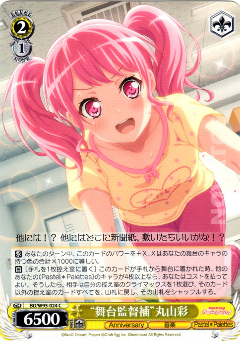 [A] – [Send one card from Hand to Waiting Room] When this card is placed on Stage from Hand, if you have four or more《Pastel*Palettes》Characters, you may pay the cost. If you did, your opponent chooses one Climax in their Waiting Room, return all other cards in their Waiting Room to their Deck, shuffle their Deck afterwards.