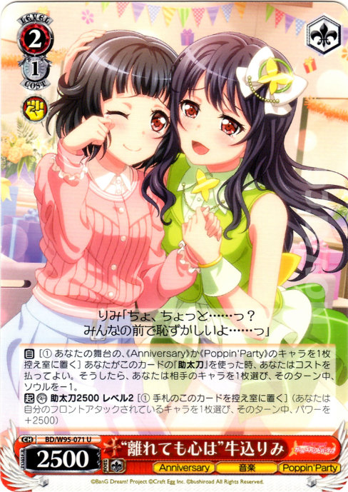 [A] – [(1) Send one of your《Anniversary》or《Poppin’ Party》Characters on Stage to Waiting Room] When you use this card’s BACKUP, you may pay the cost. If you did, choose one of your opponent’s Characters, during this turn, it gets -1 Soul.