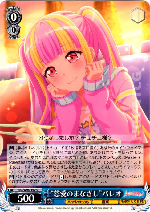 【自】[手札のレベル1以上のカードを1枚控え室に置く] あなたのメインフェイズ中、このカードが手札から舞台に置かれた時、あなたはコストを払ってよい。そうしたら、あなたは自分の控え室の自分のレベル以下のレベルの、《Pastel*Palettes》か《RAISE A SUILEN》のキャラを1枚選び、そのメインフェイズ中、そのカードを、色条件を満たさずに控え室からプレイしてよい。(クライマックスのレベルは0として扱う。コストが必要なカードならコストを払う)