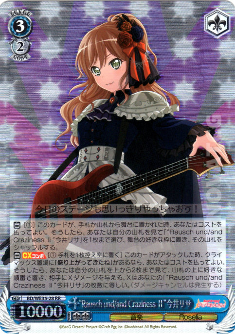 [A] – [(1)] When this card is placed on Stage from Hand or Deck, you may pay the cost. If you did, search your Deck for up to one [“Rausch und/and Craziness II” 今井りさ], place it onto any slot on Stage, shuffle your Deck afterwards.