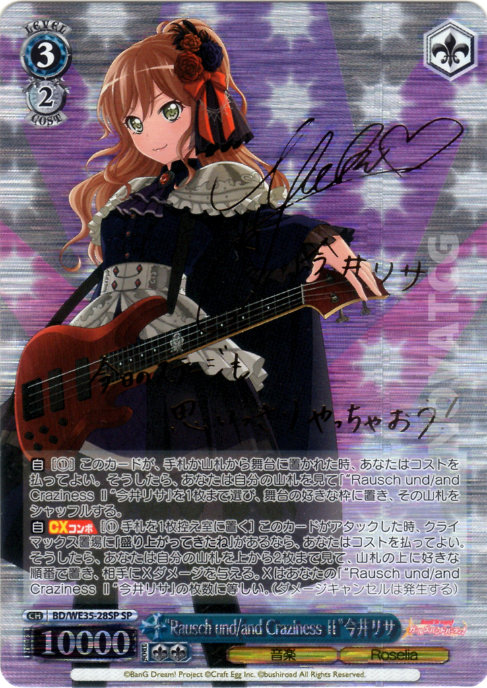 [A] – [(1)] When this card is placed on Stage from Hand or Deck, you may pay the cost. If you did, search your Deck for up to one [“Rausch und/and Craziness II” 今井りさ], place it onto any slot on Stage, shuffle your Deck afterwards.