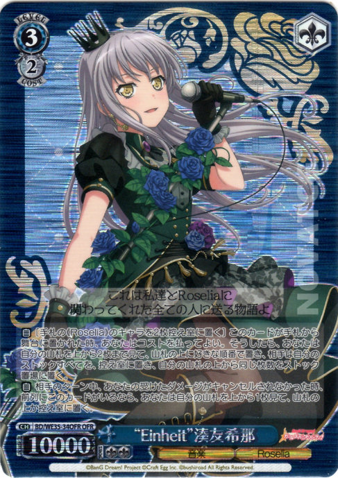 [A] – [Place two《Roselia》Characters from your Hand into Waiting Room] When this card is placed on Stage from Hand, you may pay the cost. If you did, look at the top two cards of your Deck, place them on top of Deck in any order, send all of opponent’s Stock to Waiting Room, send the same number of cards from the top of their Deck into Stock.