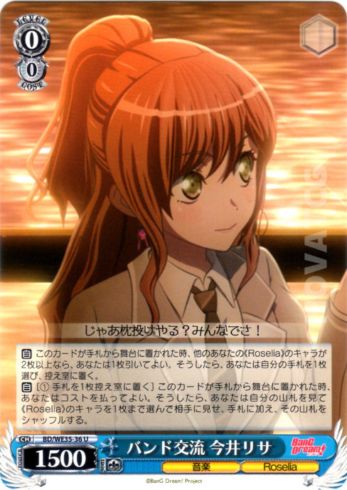 [A] – When this card is placed on Stage from Hand, if you have two or more other《Roselia》Characters, you may draw one card, if you did, choose one card in your Hand, send it to Waiting Room.