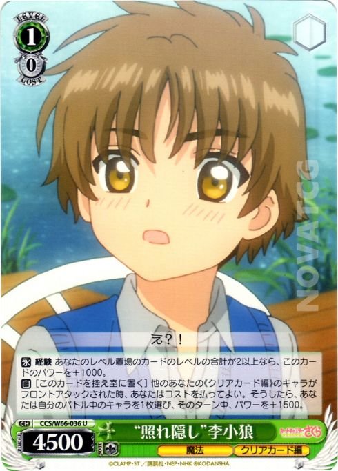 【自】[このカードを控え室に置く] 他のあなたの《クリアカード編》のキャラがフロントアタックされた時、あなたはコストを払ってよい。そうしたら、あなたは自分のバトル中のキャラを1枚選び、そのターン中、パワーを+1500。