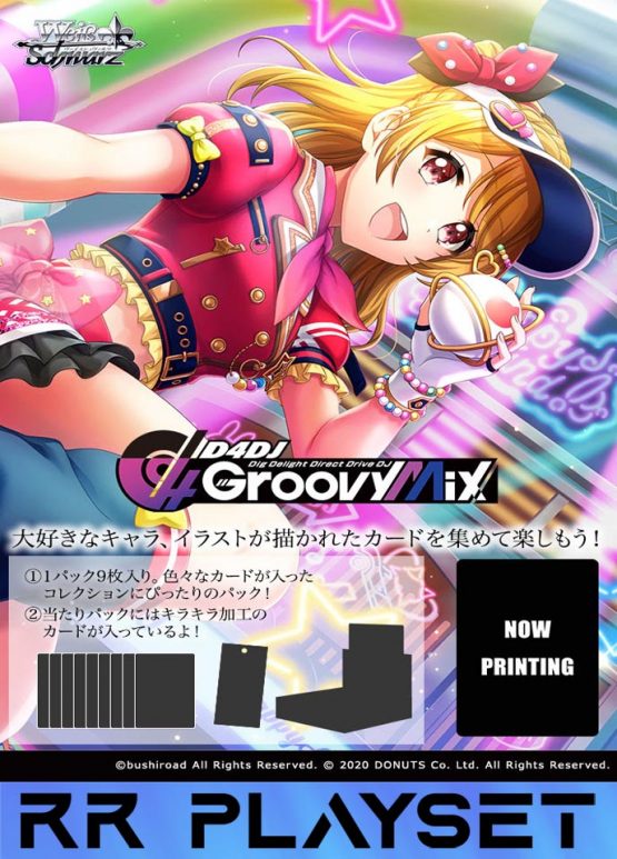 This will come with 4 copies of all of the following rarities: C/U/R/CC/CR/RR from the “D4DJ Groovy Mix” Weiss Schwarz booster set.