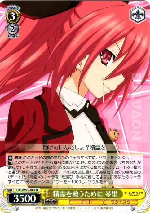【自】 このカードが手札から舞台に置かれた時、次の3つの効果のうちあなたが選んだ1つを行う。『あなたは自分の山札を上から3枚まで見て、カードを1枚まで選び、手札に加え、残りのカードを控え室に置く。』『あなたは自分の控え室の、《デート》か《精霊》のキャラを1枚選び、手札に戻してよい。』『あなたのキャラすべてに、そのターン中、パワーを+1000し、ソウルを+1。』