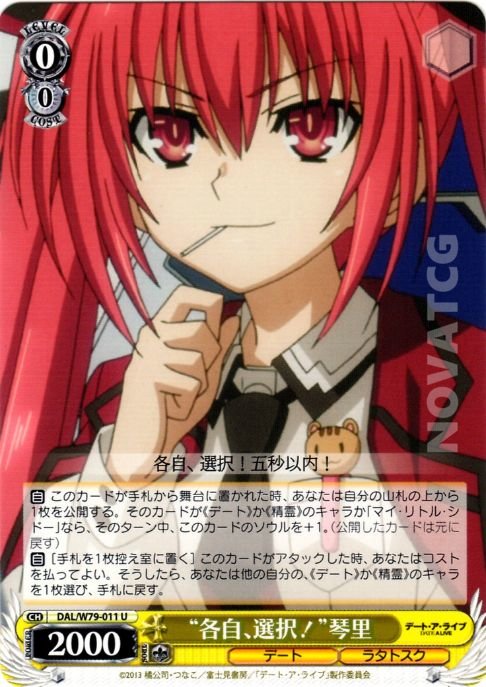 【自】[手札を1枚控え室に置く] このカードがアタックした時、あなたはコストを払ってよい。そうしたら、あなたは他の自分の、《デート》か《精霊》のキャラを1枚選び、手札に戻す。