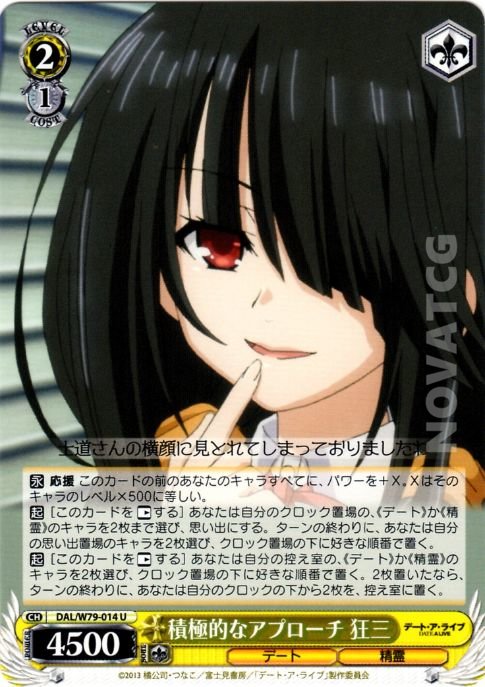【起】[このカードを【レスト】する] あなたは自分の控え室の、《デート》か《精霊》のキャラを2枚選び、クロック置場の下に好きな順番で置く。2枚置いたなら、ターンの終わりに、あなたは自分のクロックの下から2枚を、控え室に置く。