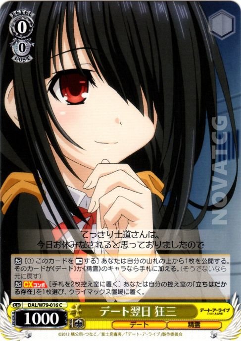 【起】[(1) このカードを【レスト】する] あなたは自分の山札の上から1枚を公開する。そのカードが《デート》か《精霊》のキャラなら手札に加える。(そうでないなら元に戻す)