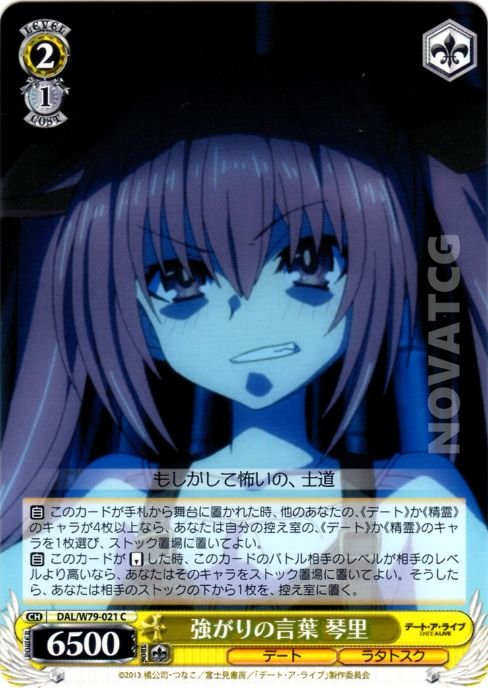 【自】 このカードが手札から舞台に置かれた時、他のあなたの、《デート》か《精霊》のキャラが4枚以上なら、あなたは自分の控え室の、《デート》か《精霊》のキャラを1枚選び、ストック置場に置いてよい。